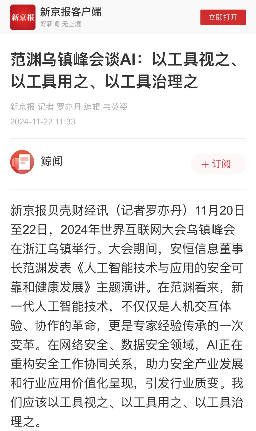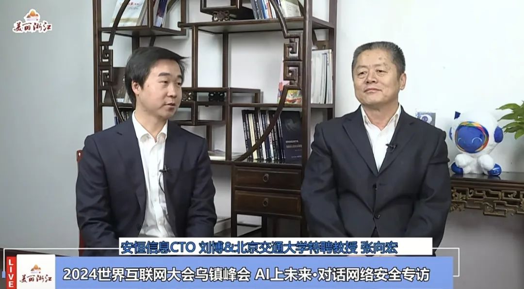2024年世界互联网大会乌镇峰会,安恒信息董事长范渊发表《人工智能技术与应用的安全可靠和健康发展》主题演讲。新华网、新京报、浙江卫视等媒体对此进行报道。