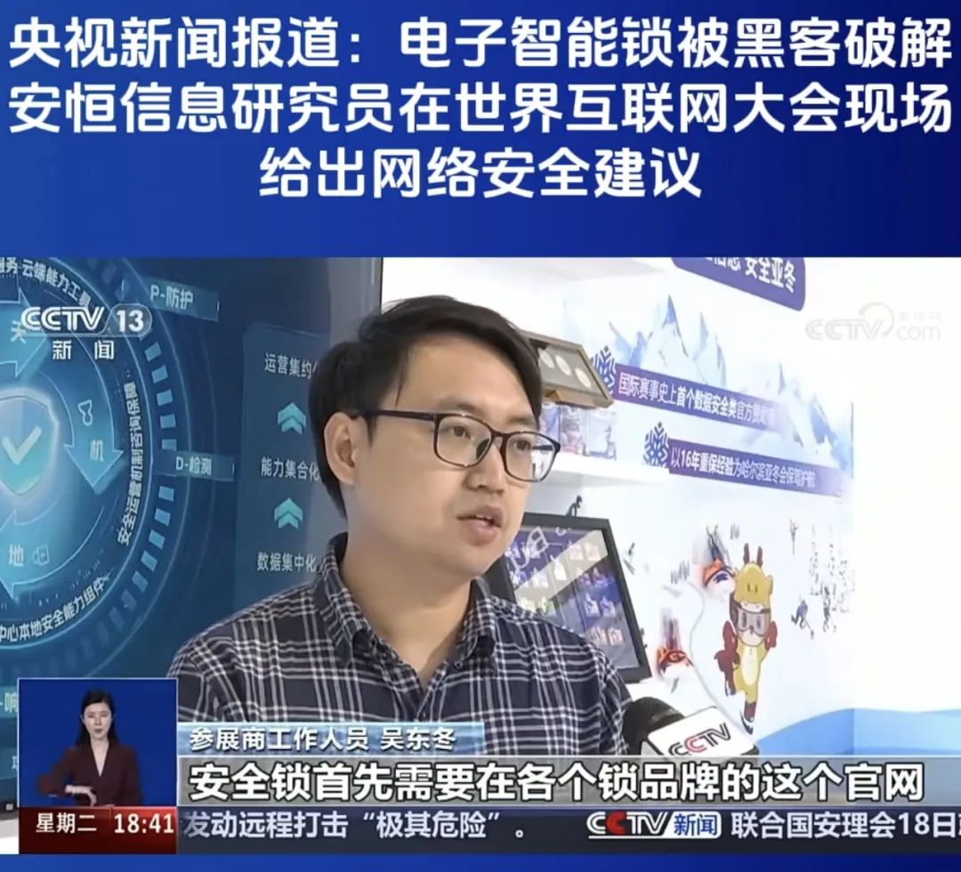 央视新闻报道:围绕“电子智能锁密码安全”,央视记者在世界互联网大会现场采访安恒信息研究员,为消费者给出网络安全建议。