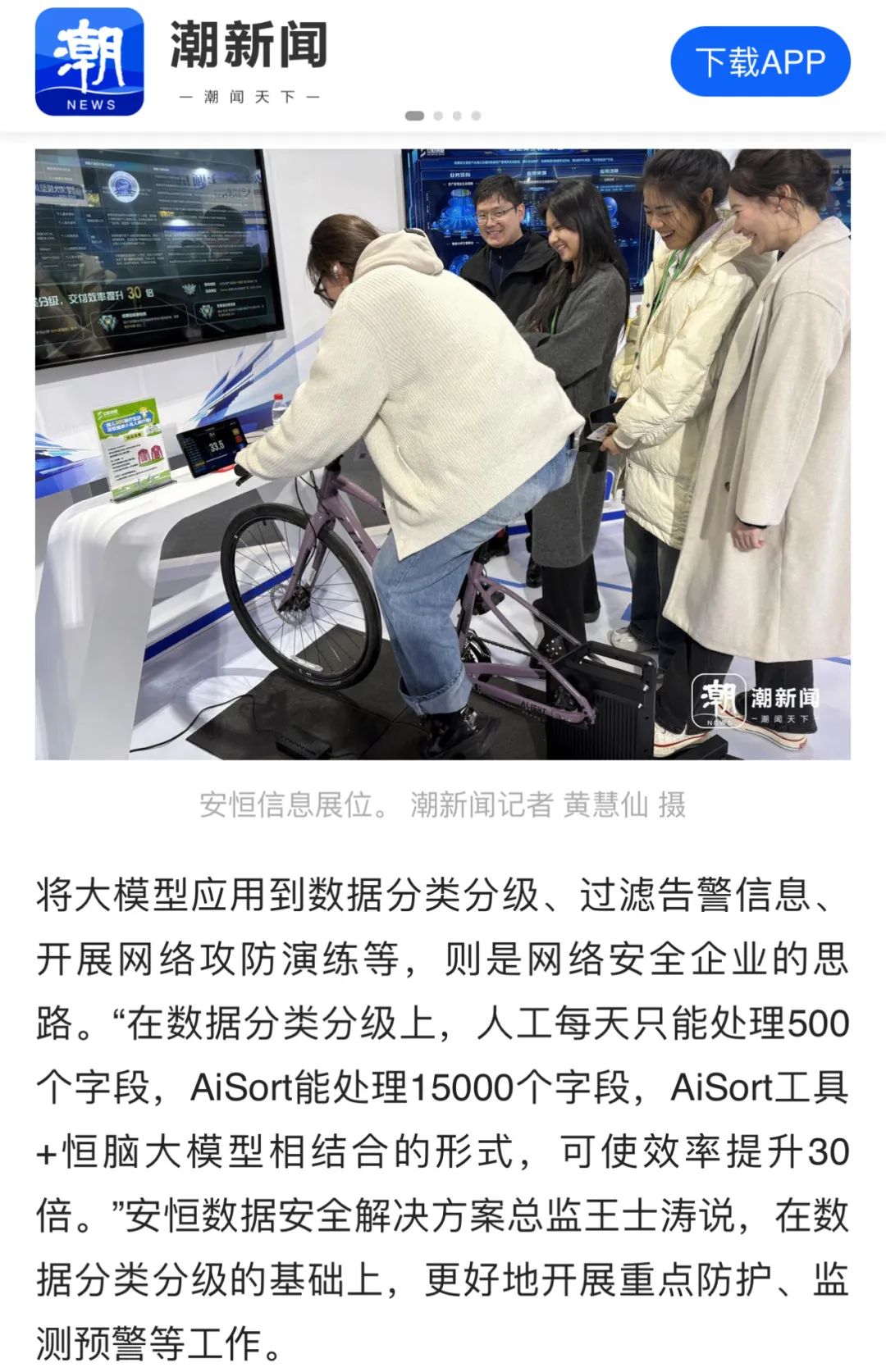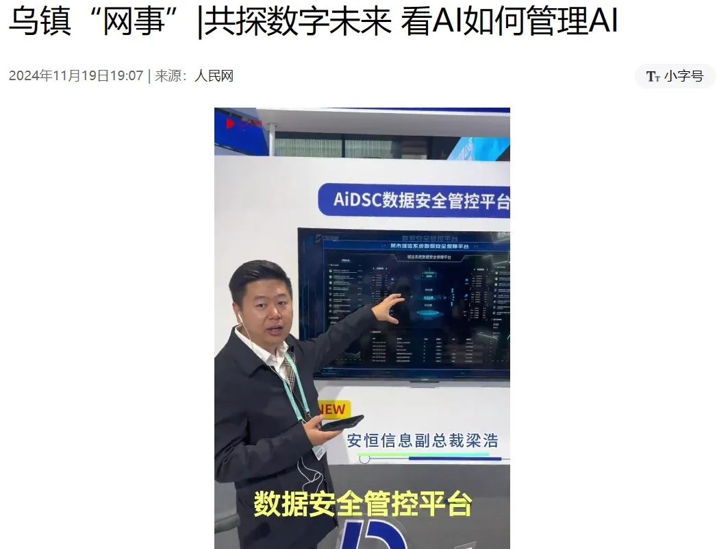 “互联网之光”博览会上,人民网、浙江日报、潮新闻等媒体记者参观安恒信息展位,报道大模型应用到数据分类分级、过滤告警信息、开展网络攻防演练等。