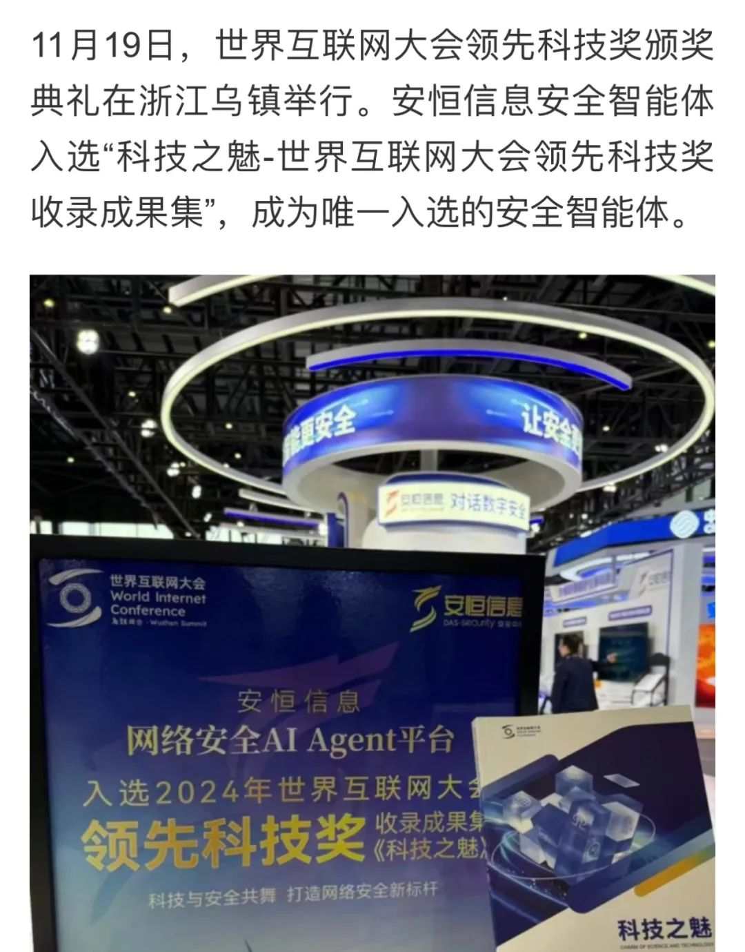 中国青年报、工人日报、中国新闻网、杭州日报、南方日报:安恒信息安全智能体入选“科技之魅-世界互联网大会领先科技奖收录成果集”,成为唯一入选的安全智能体。