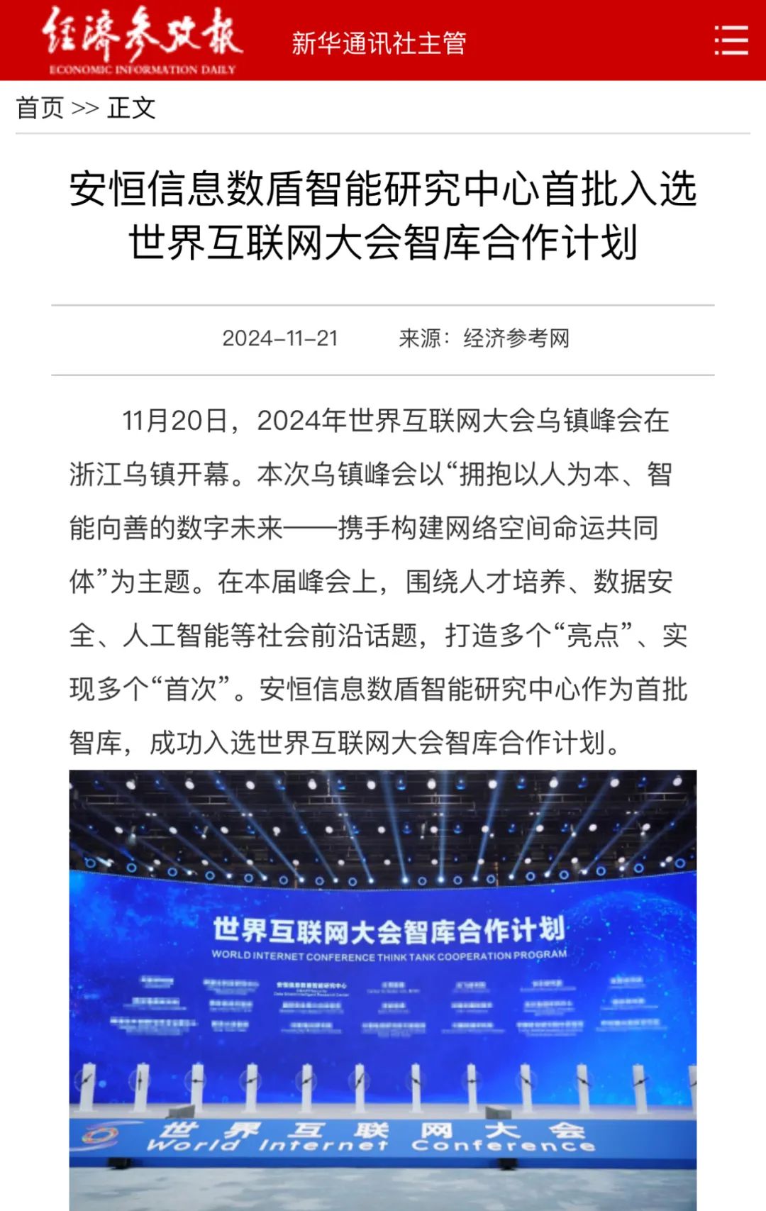 经济参考报、新华网报道,安恒信息数盾智能研究中心作为首批智库,成功入选世界互联网大会智库合作计划。