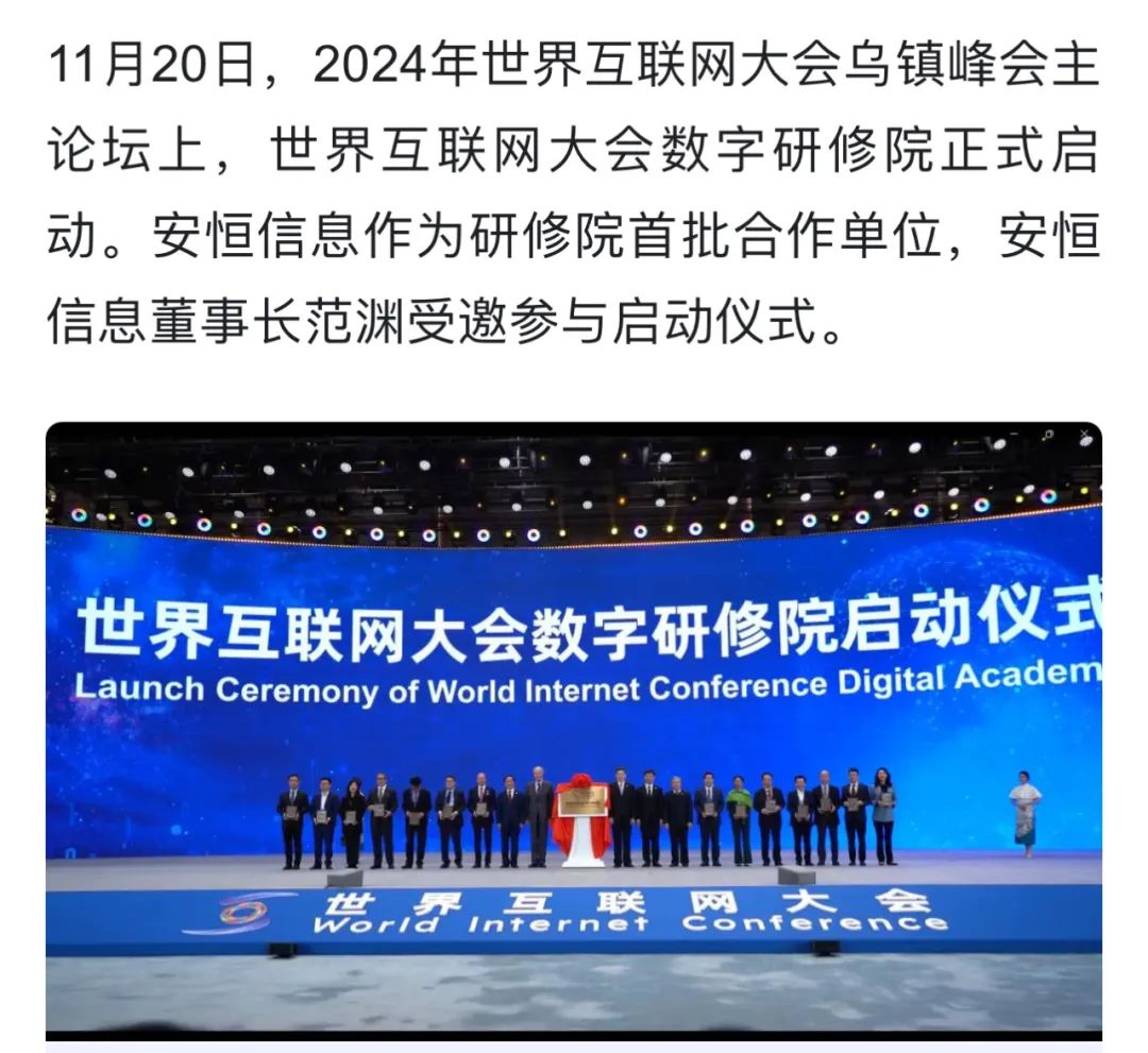 科技日报、新华网报道,2024年世界互联网大会乌镇峰会主论坛上,世界互联网大会数字研修院正式启动。安恒信息作为研修院首批合作单位,安恒信息董事长范渊受邀参与启动仪式。