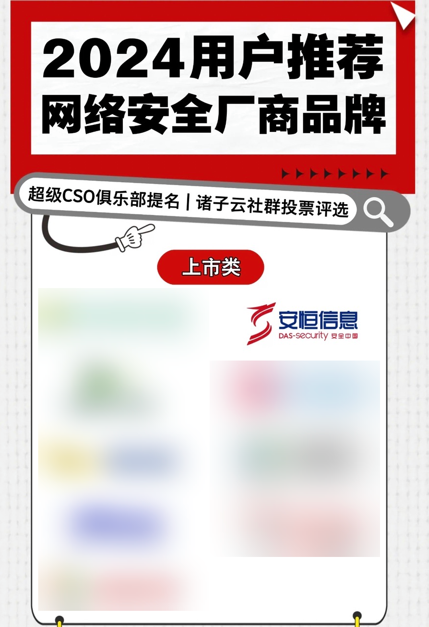 安在新媒体报道,安恒信息入选“诸子云 | 2024用户推荐网络安全厂商品牌”榜单。