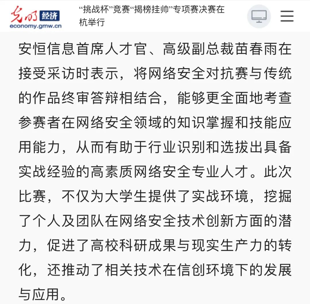 近日,第十九届“挑战杯”竞赛“揭榜挂帅”专项赛终审决赛浙江场举行。光明网报道采访安恒信息首席人才官、高级副总裁苗春雨。