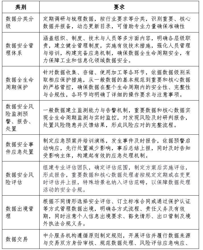 完善数据安全政策标准:建立健全工业领域数据安全管理制度,持续完善重要数据识别、备案、分级防护等全流程监管机制。