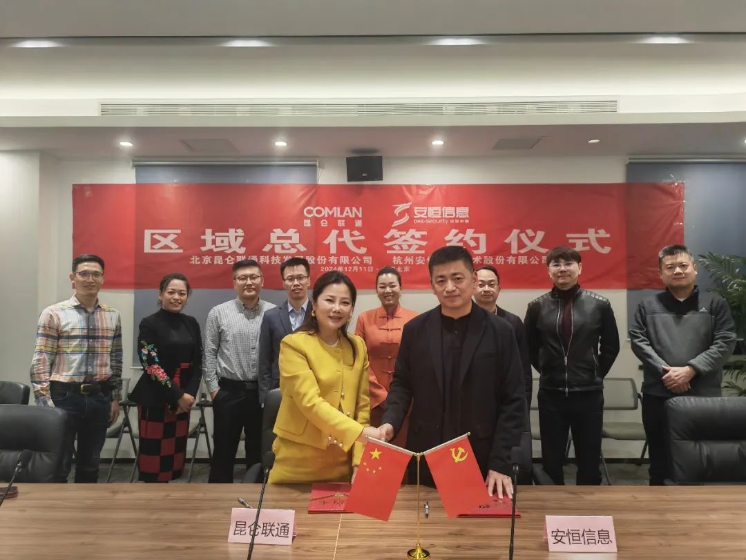 12月11日,北京昆仑联通科技发展股份有限公司与安恒信息在北京签署北京区域总代合作协议。昆仑联通副总裁崔岳与安恒信息高级副总裁赵万国,副总裁吴伟京,副总裁周丽萍以及双方相关业务负责人共同出席签约仪式。