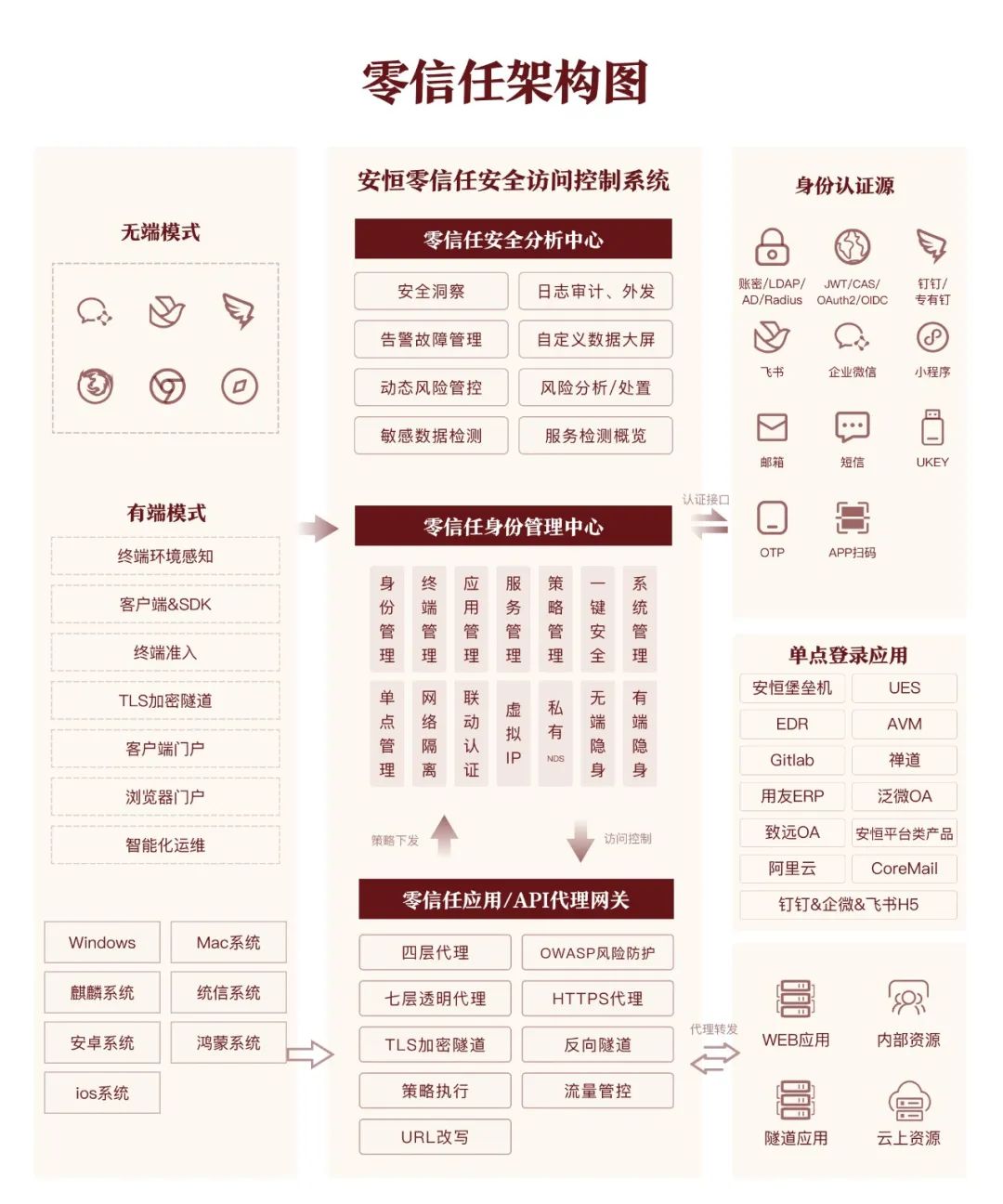 打通身份源,建立统一身份管理体系,实现身份信息全生命周期管理;通过OA APP集成零信任SDK,用户无需额外安装客户端,且一次身份认证后建立安全加密隧道实现用户无感的安全接入访问体验。