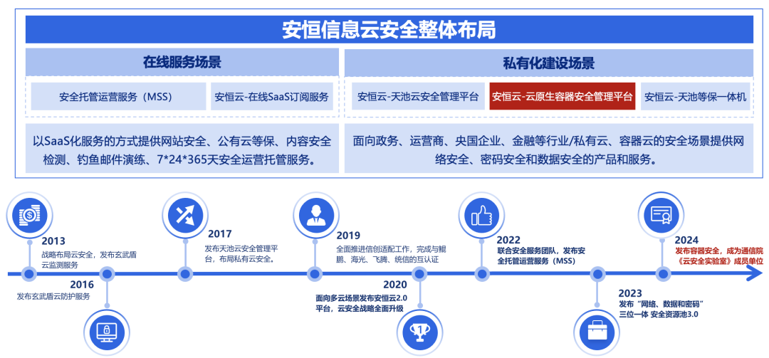过去11年以来,安恒信息长期深耕云安全,发布了「玄武盾云检测/云防护」、「天池云安全资源池」和「安全托管运营服务MSS」等众多明星云安全产品和云安全服务。