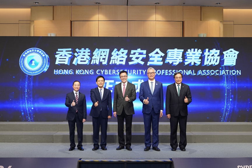 中央政府驻港联络办秘书长王松苗(左二)、创科局局长孙东(中)、数字政策专员黄志光(左一)、香港互联网注册管理有限公司主席陈细明(右一)和香港网络安全专业协会会长郑松岩(右二)