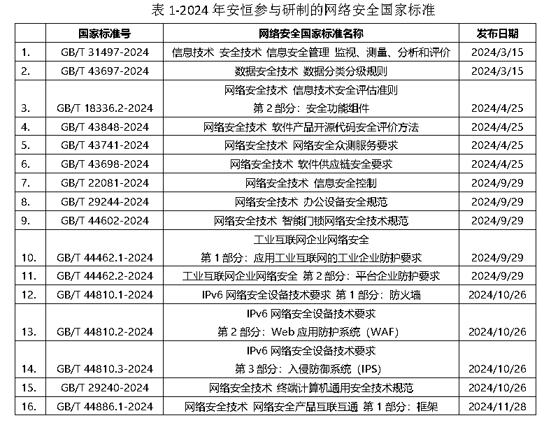 2024年,安恒信息深度参与的16项网络安全国家标准获得正式发布实施。这些标准涵盖了包括安全产品、安全管理、安全服务、数据安全、设备安全、工业互联网安全、软件及软件供应链安全在内的国家网络安全保障体系建设的方方面面,也覆盖了安恒信息在数据、运营服务与人工智能等前瞻性产品、技术与重要的业务领域。