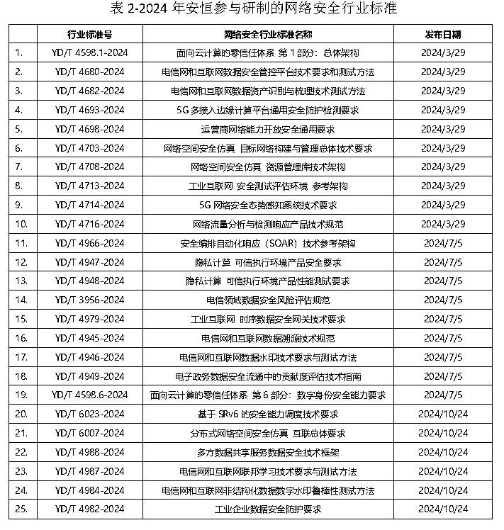2024年,安恒信息参与的25项网络安全行业标准获得正式发布实施。在贡献安恒智慧的同时,通过CCSA平台,与国内与国际的网络安全技术前沿与市场共同脉动,第一时间参与到网络安全行业技术规则制定工作中。