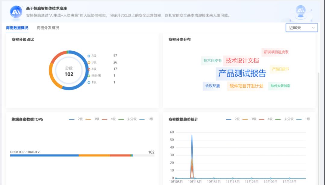 此外,基于恒脑智能体底座,不同视角可视化展示商业秘密当前概况,提升70%以上的安全运营效率。