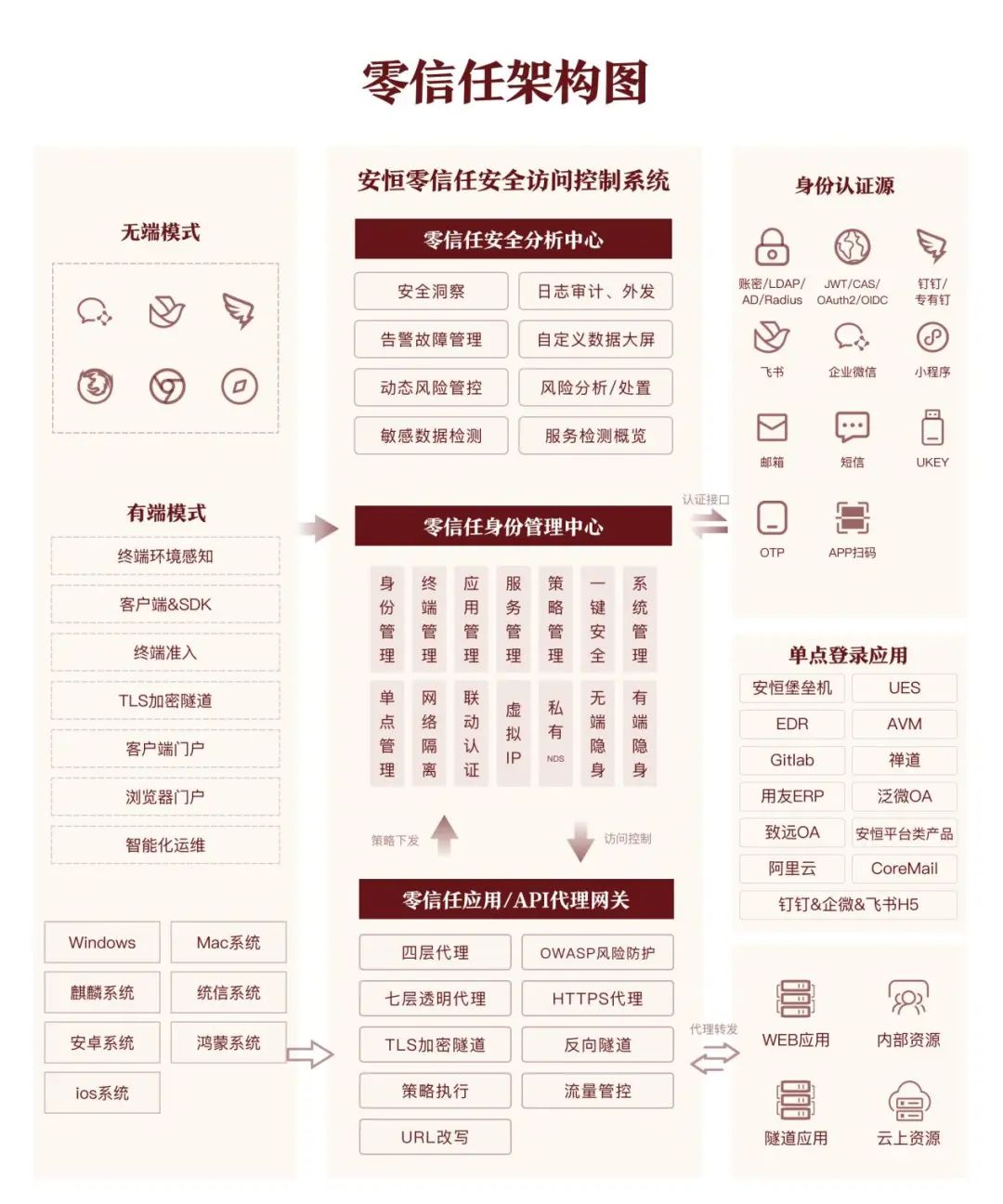 安恒信息AiTrust零信任基于零信任技术理念,实现了安全防护模式的创新转变。告别传统以网络区域边界为核心的防护模式,迈向接入安全场景,聚焦身份安全合规的全新架构,完成可信验证后可构建访问连接,精心打造可信身份网络与零信任安全基石。与此同时,该系统与办公智盾深度交融,借助一体化终端解决方案,递呈办公安全的安全闭环:涵盖安全接入、入侵防护、商业秘密防护以及终端精细管控等功能,为用户传递随时随地畅享的安全办公环境的产品价值,使其在数字化工作空间中无安全无忧。