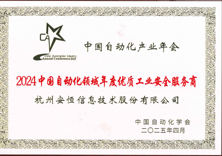 2025年4月16日,中国自动化学会(CAA)在其举办的2025中国自动化产业年会暨第二十届自动化产业世纪行颁奖盛典上正式公布2024年度自动化领域奖项评选结果,安恒信息凭借在工业安全领域的卓越贡献与技术创新,第八次荣膺“年度优质工业安全服务商”称号。这一殊荣不仅彰显了安恒信息在工业安全领域的领先地位,更印证了其技术实力与服务能力的行业高度认可。