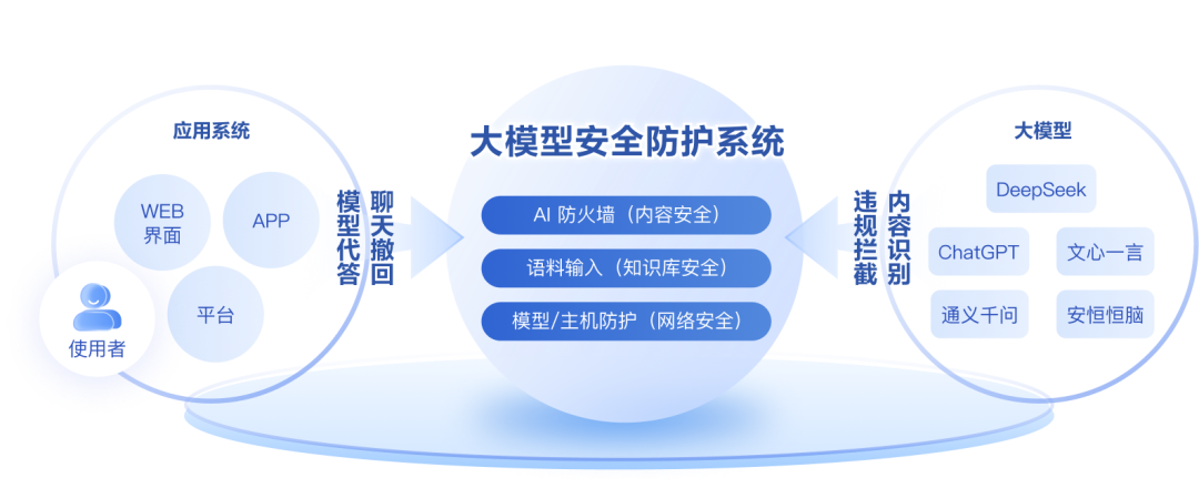 覆盖大模型资产从语料输入、模型输入输出内容到事后审计封禁全链路防护路径。