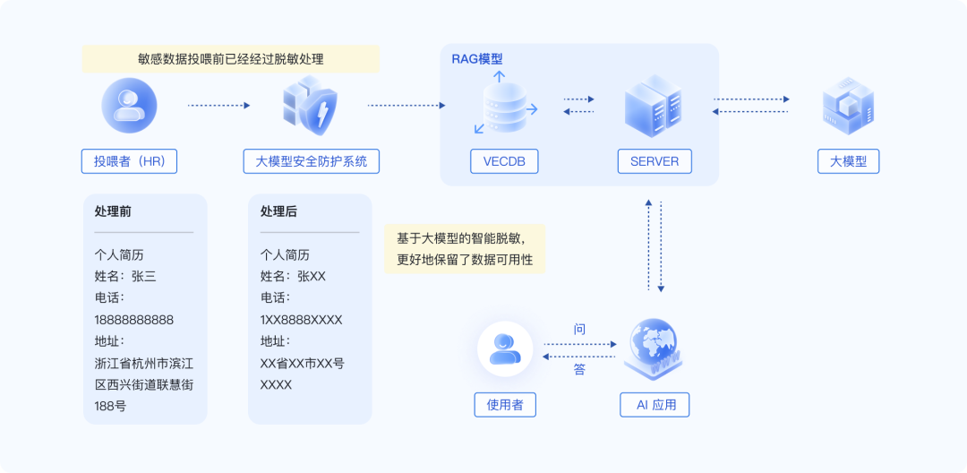 解决方案:在数据输入阶段介入脱密信息处理,使进入 RAG 语料库的资料均为脱敏后材料,基于大模型的智能脱敏在保护敏感信息的同时保留数据可用性。