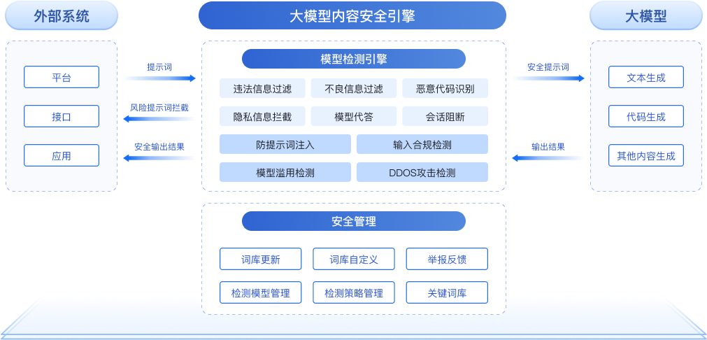 解决方案:内置大模型内容安全引擎,在输入阶段评估提示词,防止生成非法结果;在输出阶段检测违规内容,及时阻断并进行事后审计。支持模型接口代理方式实时检测与阻断,通过三道过滤防线保障内容安全。