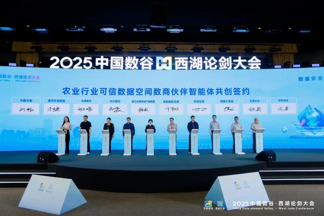 最后进行了两项签约仪式。浙江省未来农场产业技术联盟常务副秘书长杨君、杭州高新数联互通科技有限公司总经理卞阳、浙江中兴慧农信息科技有限公司董事长孟震、明康汇生态农业集团有限公司轮值总裁陈祥龙、兵峰(浙江)数字科技有限公司董事长刘立峰、浙江托普云农科技股份有限公司智慧农业研究院执行副院长姚晟、浙江道济农业集团有限公司副总经理于东辰、中科台达(浙江)信息技术有限公司总经理周建、浙江中数引擎科技有限公司合伙人刘畅、安恒信息技术股份有限公司副总裁王吾冰共同开启“农业行业可信数据空间数商伙伴智能体共创签约”,共同推动农业数字化趋势与可信数据生态建设。