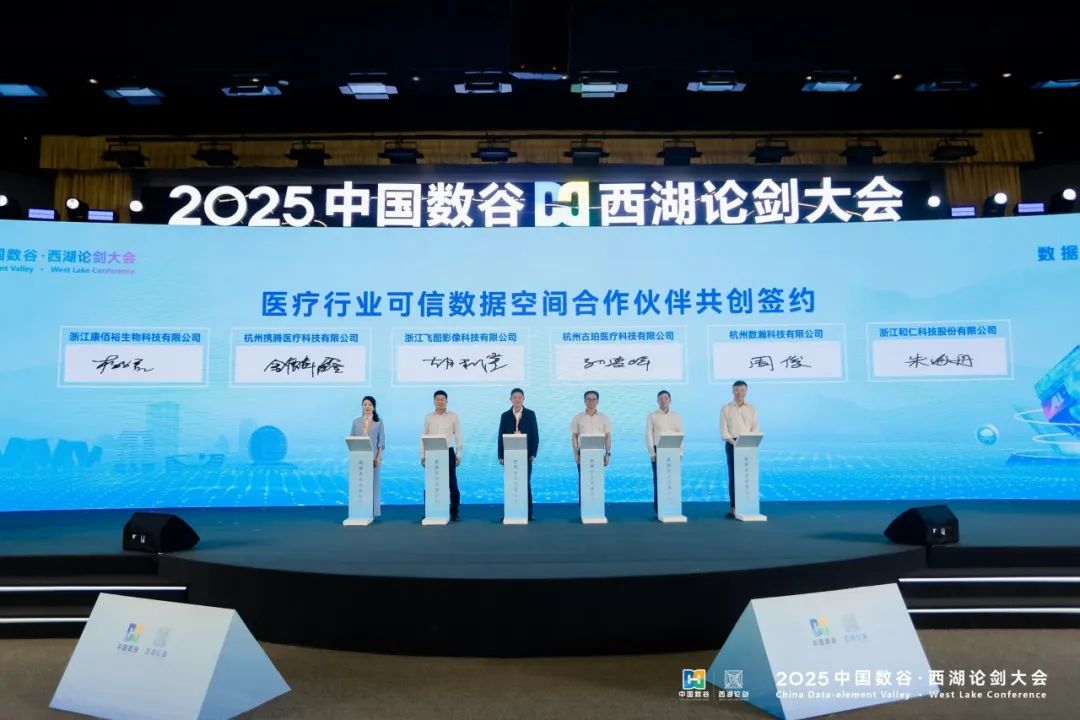 随后进行的是“医疗行业可信数据空间合作伙伴签约仪式”,浙江康佰裕生物科技有限公司董事长杨文君、杭州携腾医疗科技有限公司董事长金麟鑫、浙江飞图影像科技有限公司董事长胡利荣、杭州古珀医疗科技有限公司副总经理孙青峰、杭州数瀚科技有限公司总经理周俊、浙江和仁科技股份有限公司高级副总裁朱海舟上台签约,共探人工智能前沿实践与医疗创新的融合发展之路,围绕医疗数据的安全共享、高效利用以及价值挖掘等关键环节展开深度合作。