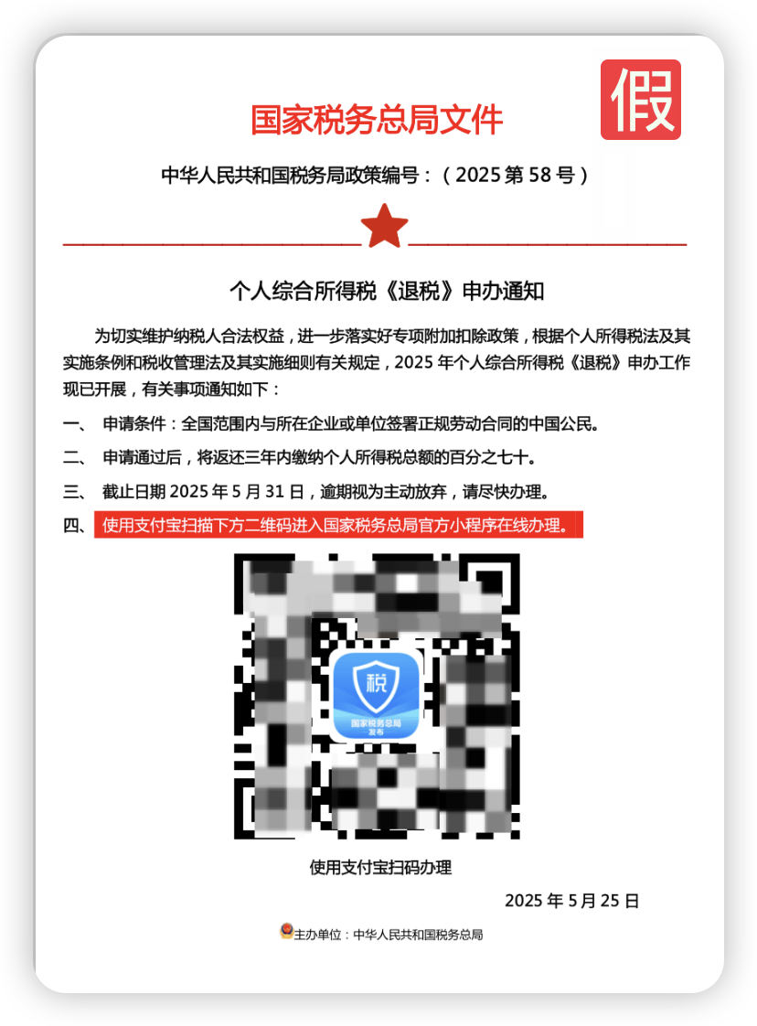如“个人所得税退税”“企业所得税汇算清缴通知”,文件名含“金税五期”、“稽查”、“退税”等关键词,诱导用户紧急下载。