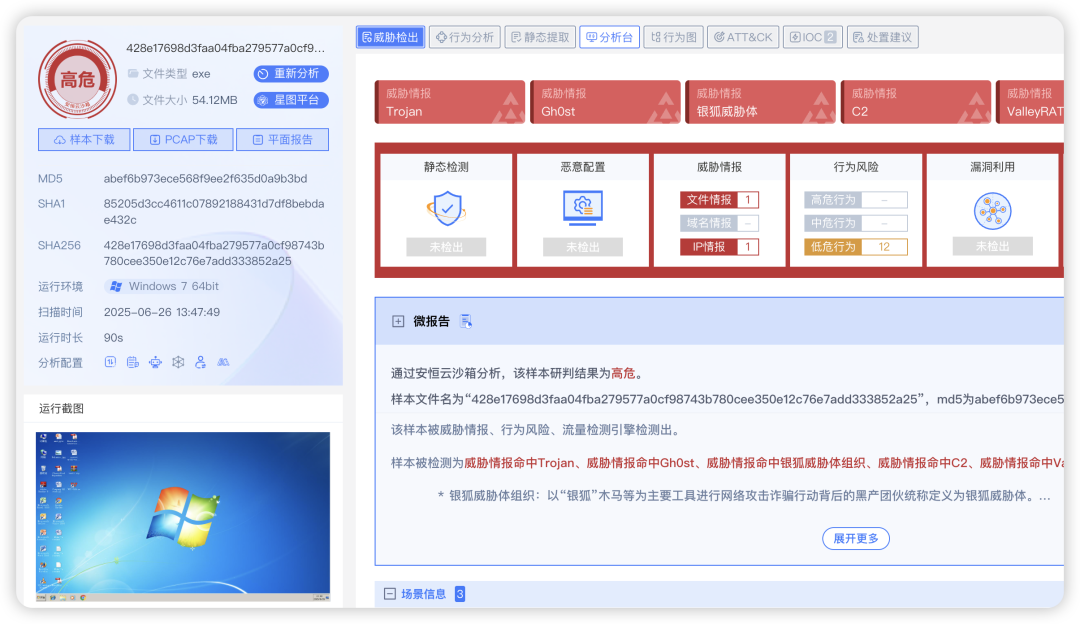 安恒云沙盒已集成了海量威胁情报及样本特征。用户可通过云沙盒:https://sandbox.dbappsecurity.com.cn/对可疑文件进行威胁研判并下载分析报告。或可用沙箱打开不明来源的未知文件,在虚拟环境中进行内容预览,免于主机失陷、受到木马或病毒文件攻击。