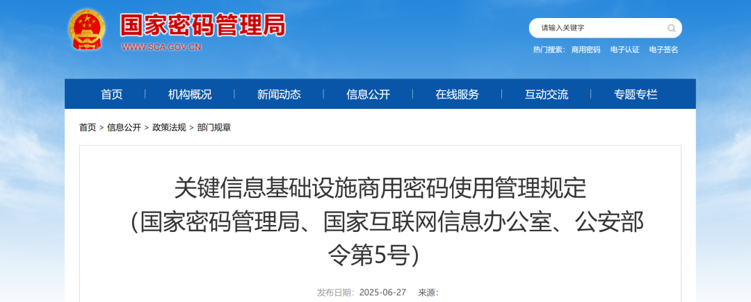 2025年6月27日,为规范关键信息基础设施的商用密码使用,经国家密码管理局、国家互联网信息办公室和公安部审议,联合发布《关键信息基础设施商用密码使用管理规定》(第5号令),并将于2025年8月1日正式实施。