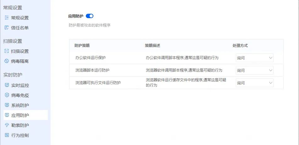 安恒安全专家面对这一紧急安全风险,启动安全应急分析及验证。经实地验证,安恒终端安全产品凭借原生具备的 “应用防护” 核心能力,能实现对该漏洞攻击链的识别与防护,为用户构筑起坚实的终端安全屏障。终端“应用防护”,就是为应对常用的应用软件如office、浏览器、IM这些应用可能被恶意利用而设计的针对性主动防御体系。