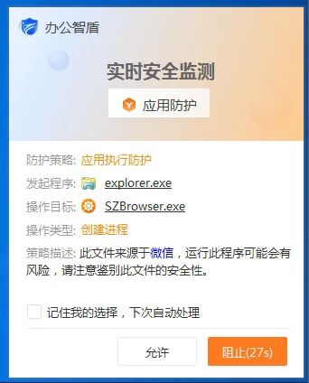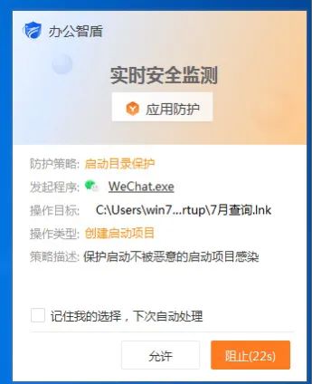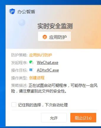 当微信下载恶意恶意文件及进行运行启动时,应用防护功能通过实时行为分析引擎,精准识别到异常文件下载及执行行为,第一时间阻断恶意代码的执行,从源头切断攻击路径。