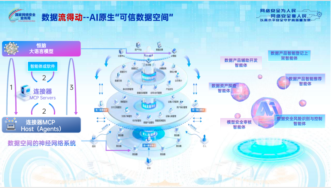 数据“流得动”是释放要素价值的关键,而可信数据空间与隐私计算技术,成为解决数据“流得动”的核心支撑。《可信数据空间发展行动计划(2024-2028 年)》明确,可信数据空间是基于共识规则、联接多方主体的重要基础设施。安恒信息构建 AI 原生“可信数据空间”,通过数据资产探查、数据产品智能登记上架、风险识别与控制、安全审核等多种智能体实现全流程智能化。