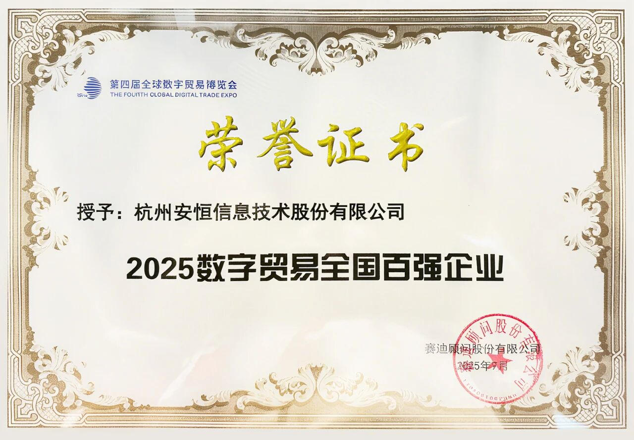 9月25日,2025全球数字贸易博览会(以下简称数贸会)作为我国唯一以数字贸易为主题的国家级、国际性、专业型展会,在杭州大会展中心盛大召开。会上,安恒信息蝉联第四届全球数字贸易博览会先锋奖(DT奖):数据终端产品——数由器荣获先锋奖(DT奖)-新锐奖,同时再次入选福布斯2025全球数字贸易行业企业100评选,连续3年上榜赛迪顾问2025全国数字贸易企业百强榜,充分展现了企业在数字安全与数据流通领域赋能数字贸易的综合竞争力。