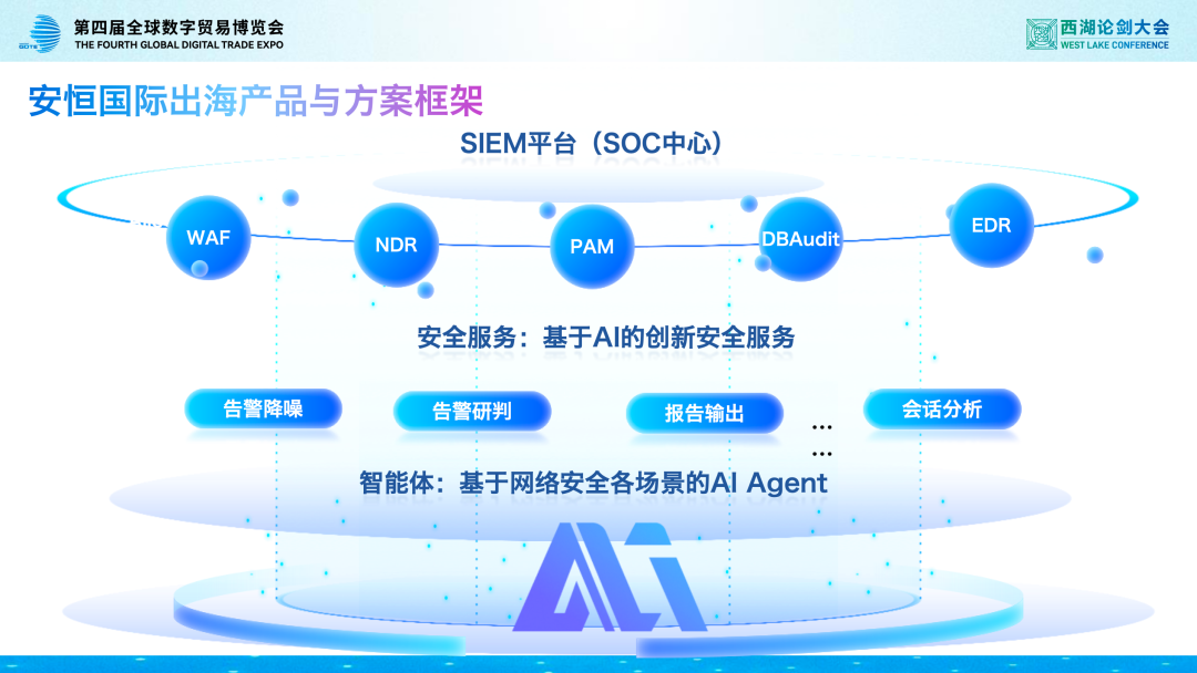 安全出海的“中国答案”,首先建立在经市场验证的产品硬实力之上。安恒信息深度应用覆盖网络安全全场景的AI Agent,重磅推出“1+5+1”最强出海产品与服务组合 —— 其中“1”为整体安全运营平台(SOC应用中心),“5” 是包含WAF、NDR、PAM、DB Audit、EDR在内的安恒核心产品矩阵,另一“1”则是基于AI技术打造的创新安全服务。