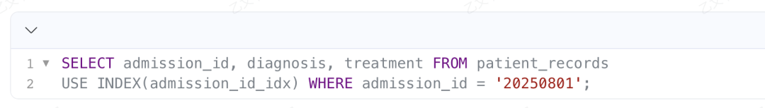 典型问题示例:SELECT * FROM patient_records WHERE admission_id = '20250801'(全表扫描、无索引)。当patient_records表中存储了数百万条患者数据时,全表扫描的耗时自然大幅增加。