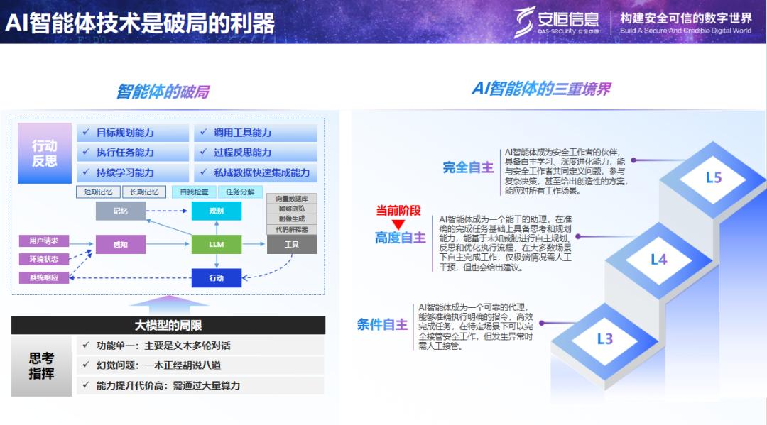 面对这些复杂挑战,AI智能体技术已经成为破局利器。智能体的自主程度可分为L3-L5三个等级:L3条件自主(能自动对已知风险进行分析,需要专家定期审视偏差);L4高度自主(能处理未知风险,遇到困难需要专家介入);L5完全自主(能总结风险处理经验,主动提出优化建议)。税雪飞表示:“当前业界正处于高度自主阶段。”