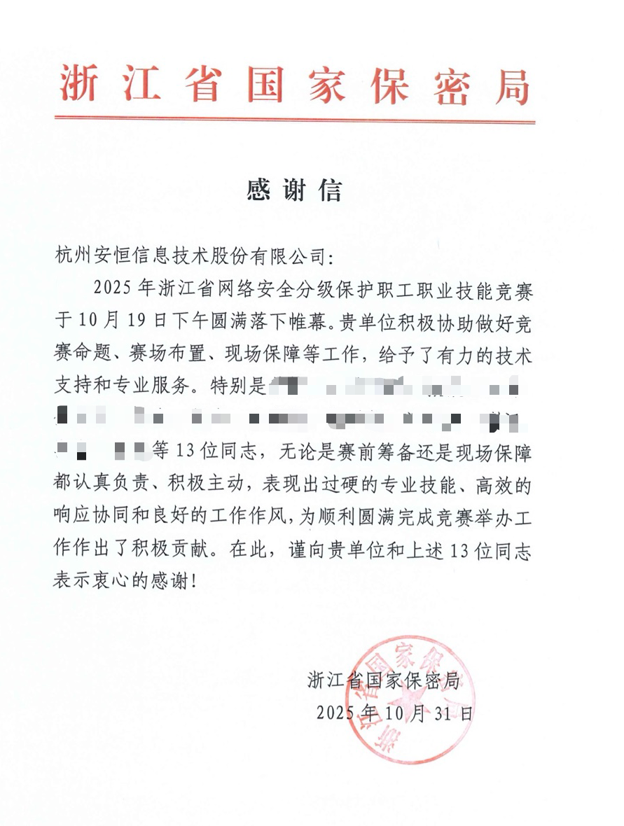 作为本次大赛的全链条技术支撑单位,安恒信息以稳定专业的竞赛平台为基座,以贴近实战的赛题设计为核心,以全程无缝的现场运维为保障,三位一体构筑了大赛的坚实基座,确保了赛事的圆满成功,获得了主办方及参赛单位的高度认可,并荣幸收到了浙江省国家保密局发来的感谢信,信中对安恒信息在竞赛中展现的专业能力、敬业精神和出色支撑给予了充分肯定,这份认可激励着我们继续深耕网络安全领域,为护航数字浙江建设贡献更大力量。