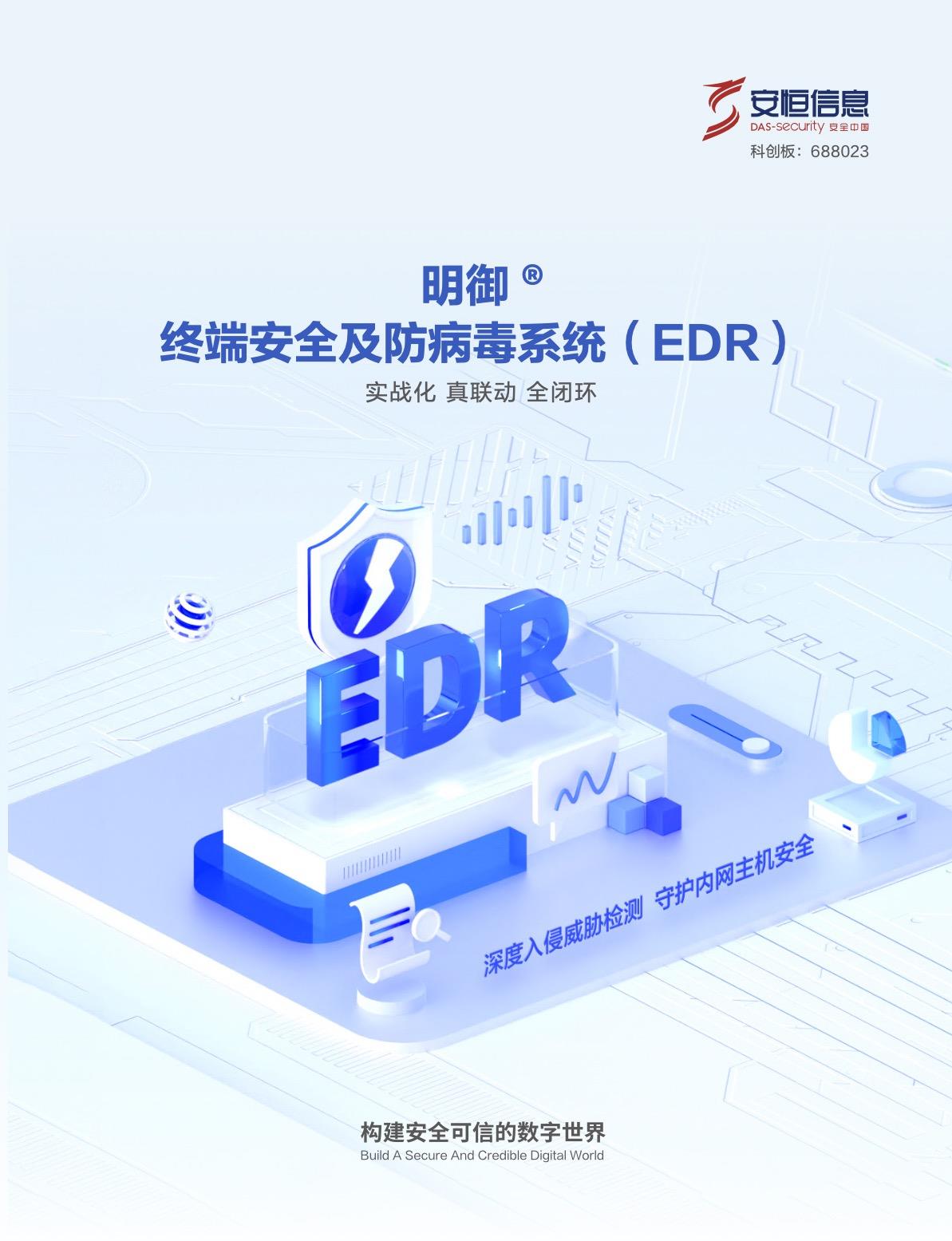 安恒信息明御®终端安全及防病毒系统(EDR)以IPDRR安全框架为核心,聚焦终端安全纵深防护,通过技术与策略的深 度融合构建“识别-防护-检测-响应-恢复”闭环能力。通过事前精准识别资产风险与主动防御部署、事中动态感知攻击 链行为与自动化协同处置、事后高效溯源分析助力筑牢防线,保障业务连续,不仅有效应对传统已知威胁,更能基于 ATT&CK攻击链建模与AI分析对抗APT攻击等高级威胁,最终形成覆盖终端全场景、全流程的自适应安全防护体系,实 现从被动防御到主动治理的范式升级。