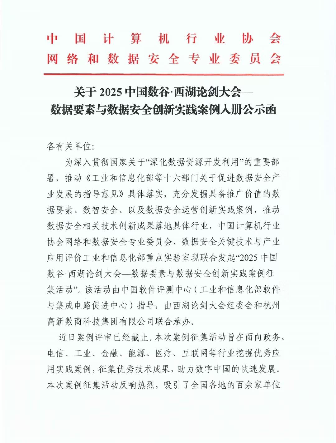 关于2025中国数谷·西湖论剑大会—数据要素与数据安全创新实践案例入册公示函