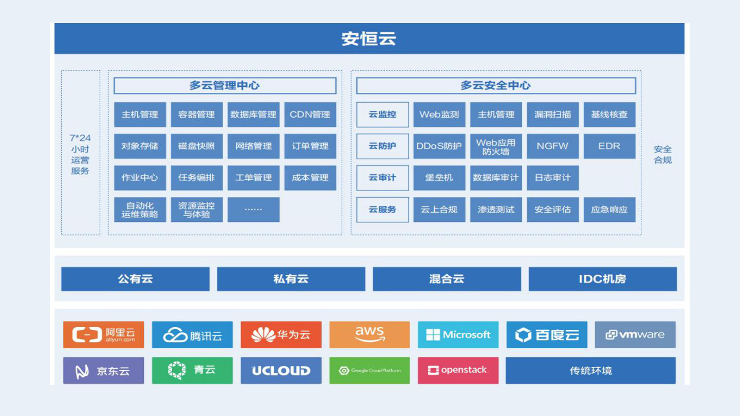 安恒云是安恒信息推出的集多云管理和多云安全于一体的一站式平台级产品,旨在为用户打造一个安全、平等的多云管理和多云安全管理服务平台。安恒云在线SaaS服务可连接国内外主流公有云,帮助用户实现公平选云、安全上云、便携管云、实惠用云。安恒云拥有丰富的多云管理能力和完善的云上安全能力,满足用户个性化的多云管理和多云安全需求。