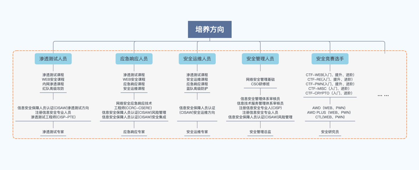 安恒信息在安全领域深耕多年,了解企事业单位对于人才培养的困境,针对常见岗位制定不同培养计划供客户挑选。