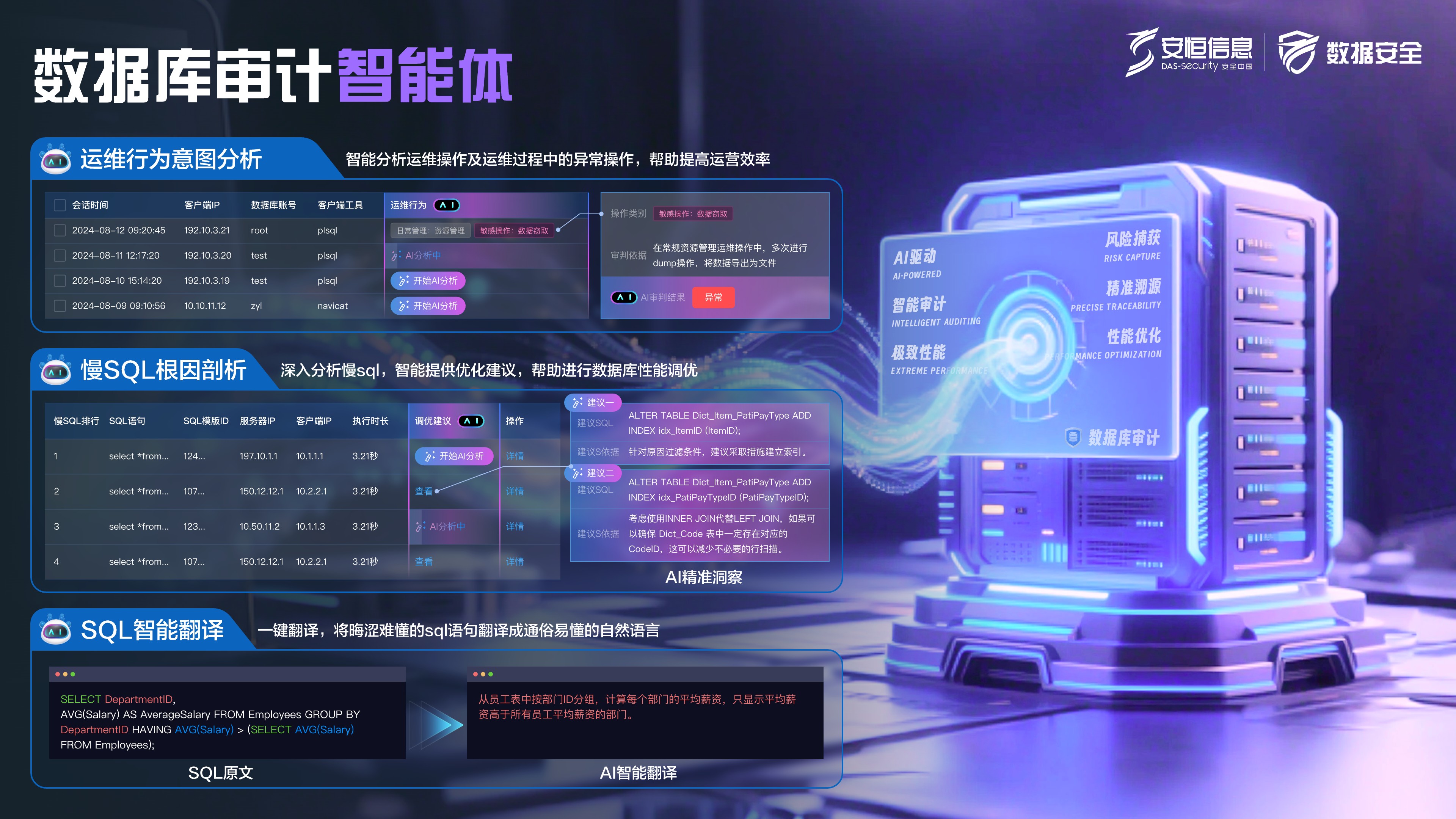 最新推出AI智能体赋能下的新一代数据库审计能力,能够帮助用户解读运维意图、剖析慢SQL成因并给出解决办法,充分提升审计产品与用户实际运维、业务的结合深度