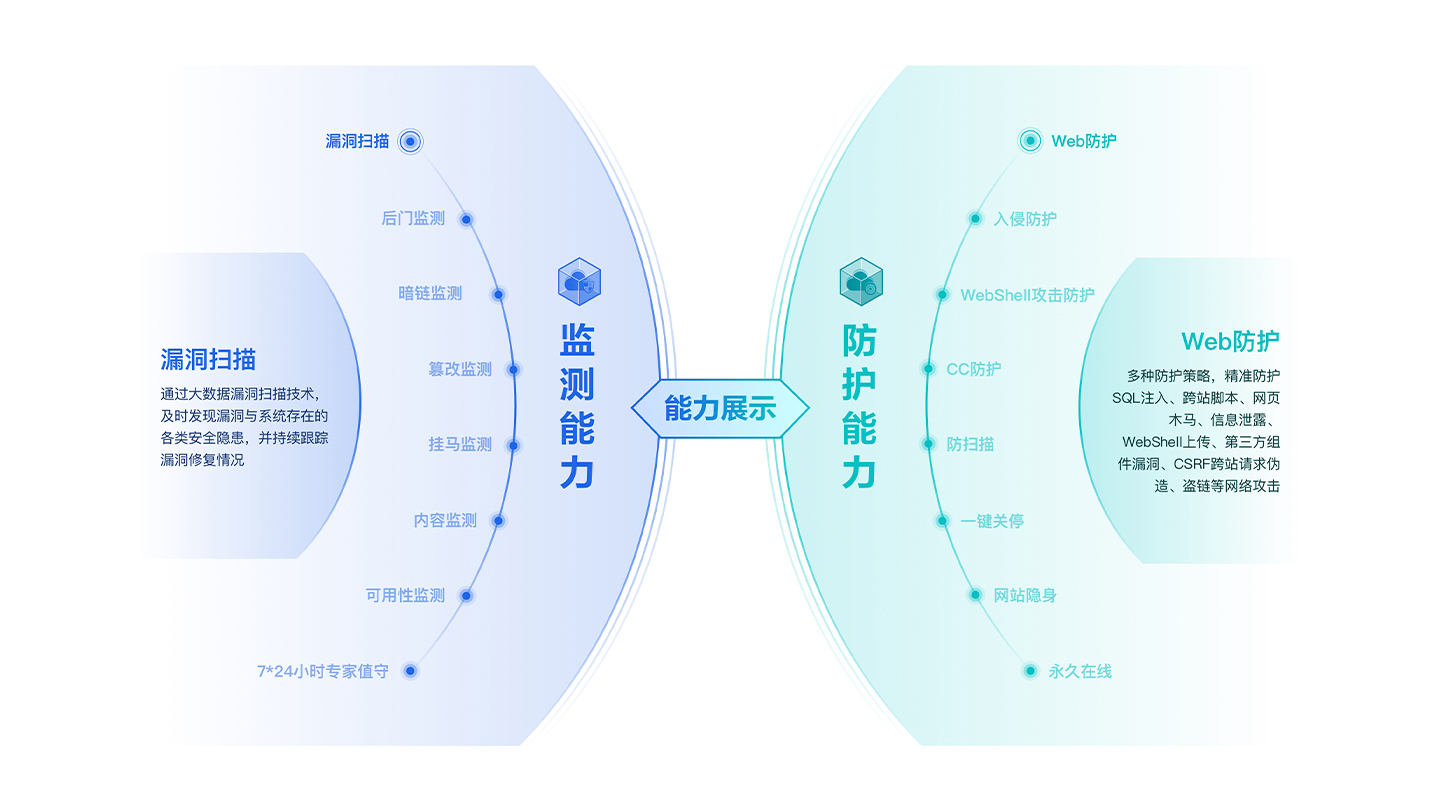 对网站web漏洞、暗链、黑页、挂马、挖矿、webshell、网站可用性、敏感词汇等进行实时监测并预警。