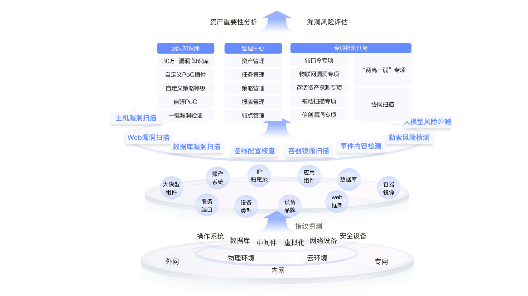 内置30W+系统漏洞库,支持授权与非授权的方式高效扫描发现操作系统、数据库、中间件、网络设备、安全设备、常用应用软件、容器镜像等安全漏洞