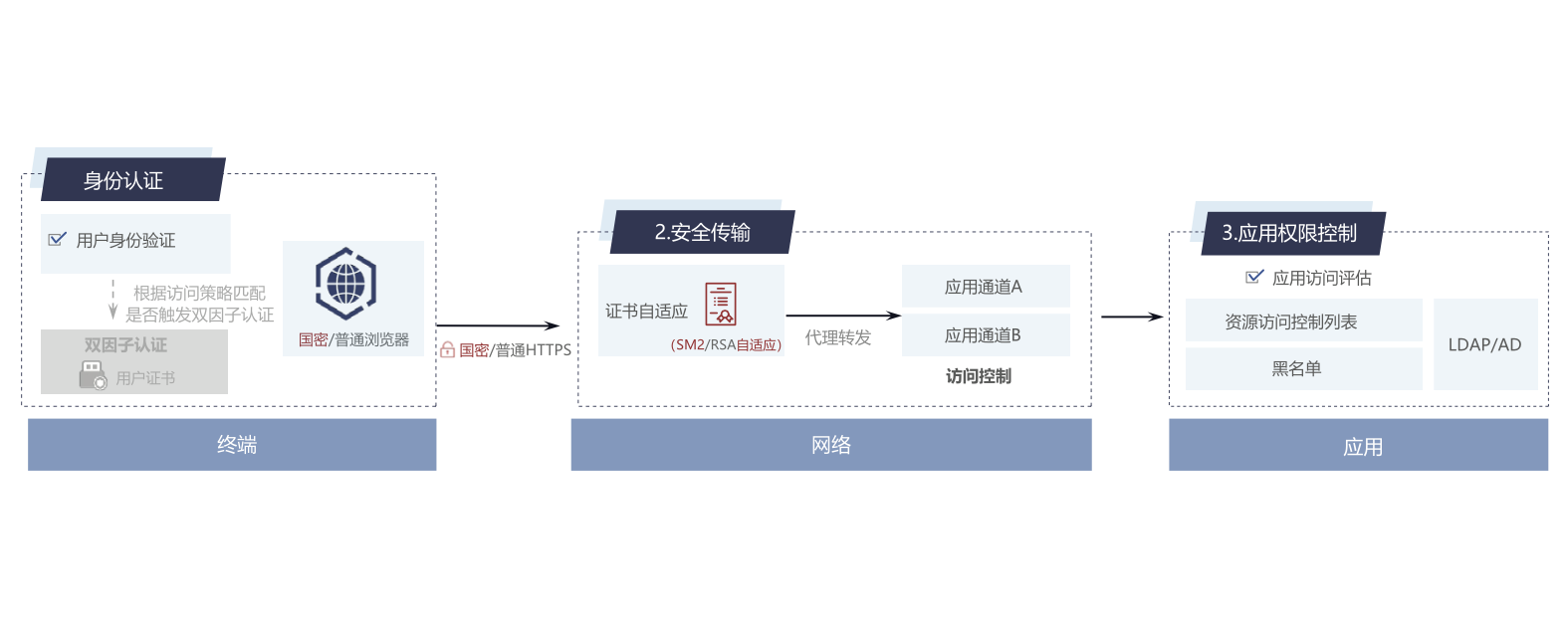 安全认证网关可为用户提供基于数字证书的高强度身份认证,在保障用户身份真实性的同时,通过 TLCP/TLS实现应用安全代理,保障应用安全访问控制,并减少后台应用服务器的性能消耗,大幅度提升整个业务应用系统的安全性和稳定性。