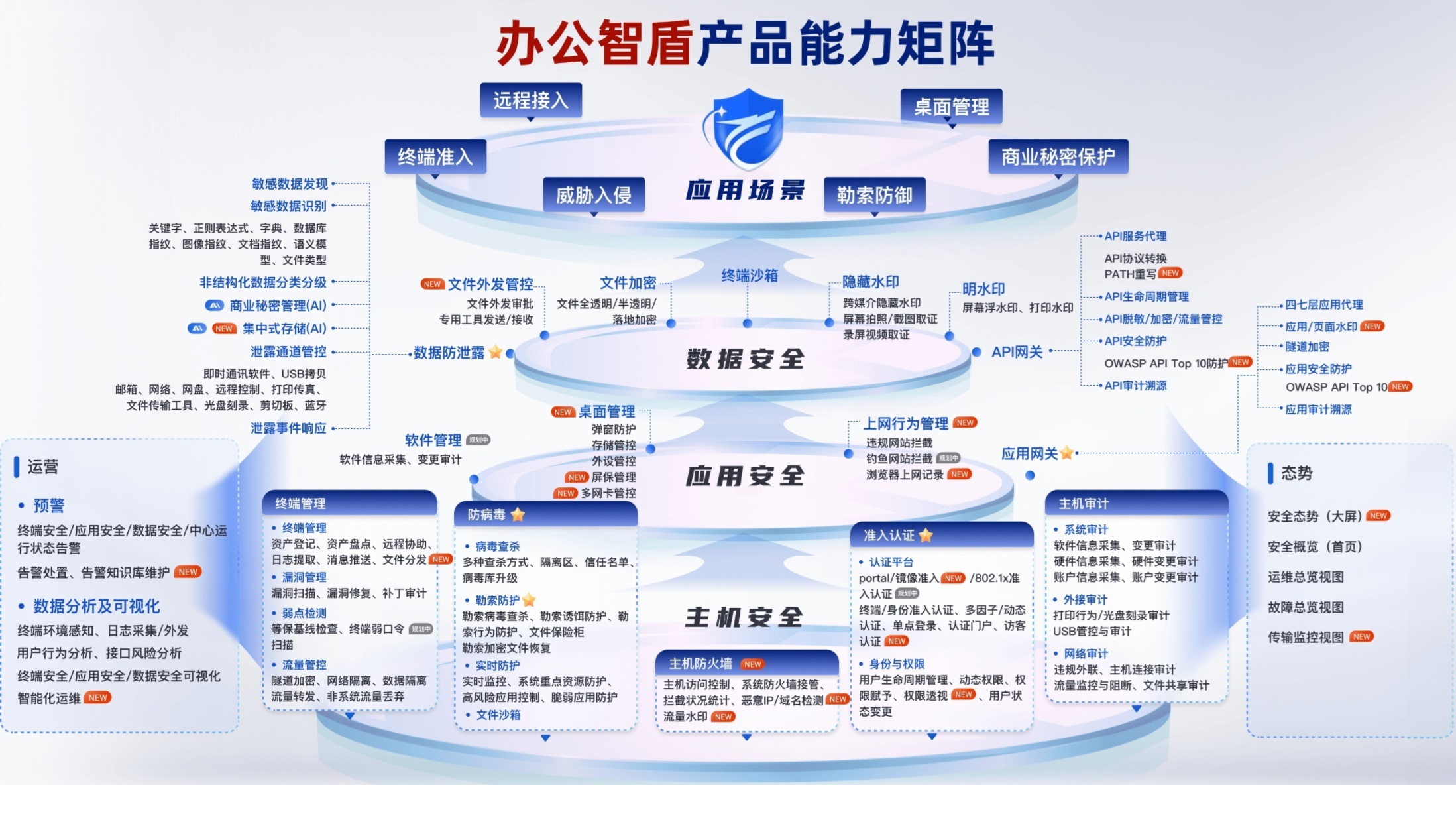 办公智盾提出新一代的终端一体化安全防护理念和解决方案,超越传统思维,从单一终端安全,变成人员、终端、网络、应用、数据全方位一体化安全。办公智盾基于模块化设计理念,集多种安全模块于一体,融合了准入、零信任、防病毒、数据防泄漏、数字水印、文件加密、主机审计、桌面管理等十多种业务,全面兼容Windows、Linux、MacOS、UOS、麒麟等主流操作系统,一个平台,一个终端,统一管理。满足用户核心应用景,包括远程接入场景、威胁入侵防护场景、商业秘密保护场景、桌面管控场景。