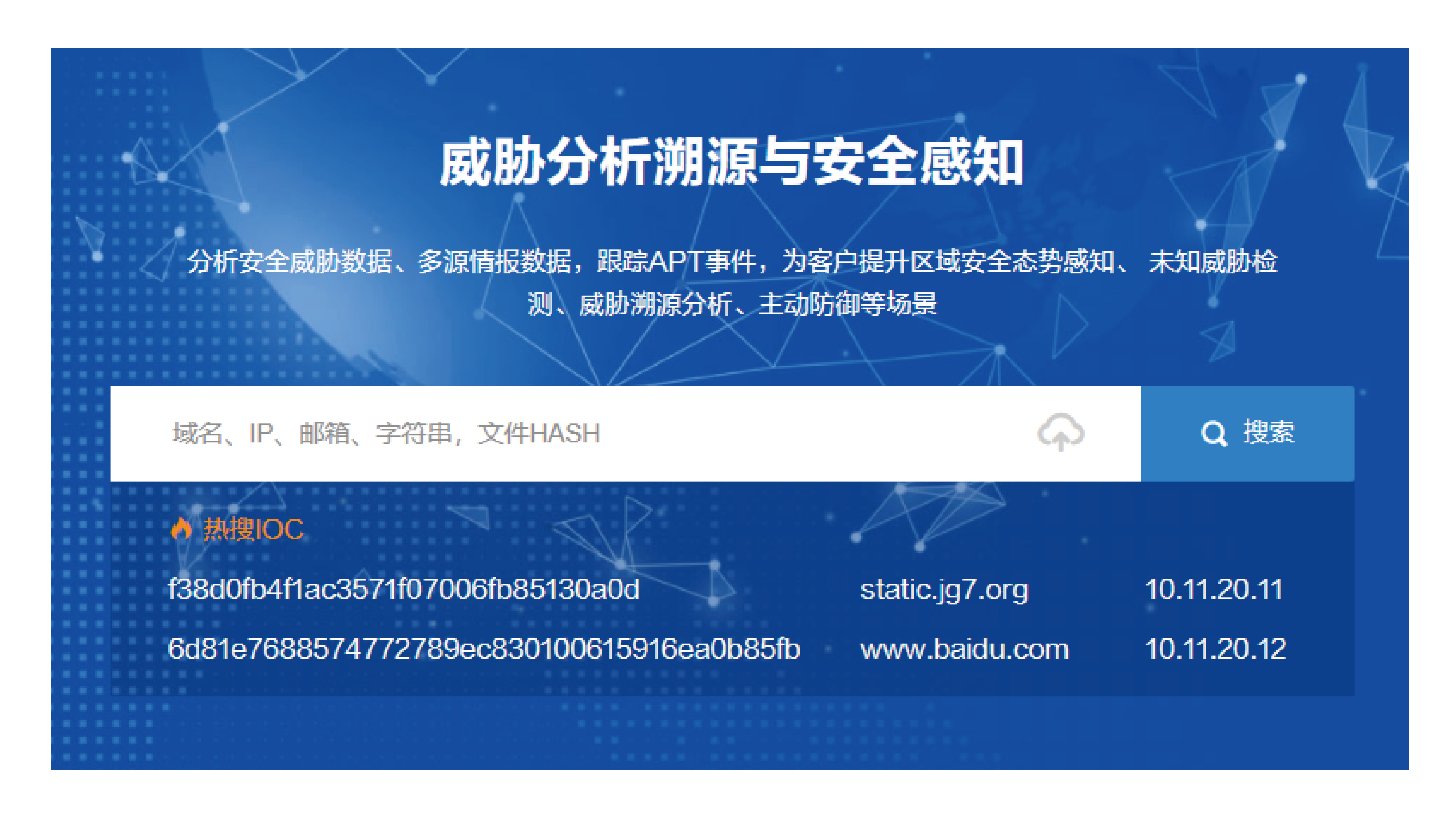 安恒威胁情报中心基于十余年的网络安全特征、SaaS防护、攻防研究的数据积累以及商业情报、开源情报、自研情报的海量威胁信息,结合云和大数据技术形成了高覆盖率、高精确性、上下文丰富的威胁情报知识库。安恒威胁情报中心在提升十多种安全产品能力的同时,首推了一体化威胁情报中心方案:具备情报生产、威胁检测、情报分析、情报订阅、情报资讯、朔源分析等能力。帮助用户构建以“威胁情报”为驱动力的智能安全平台,实现关联分析、主动防御、风险降噪、应急响应等应用价值。