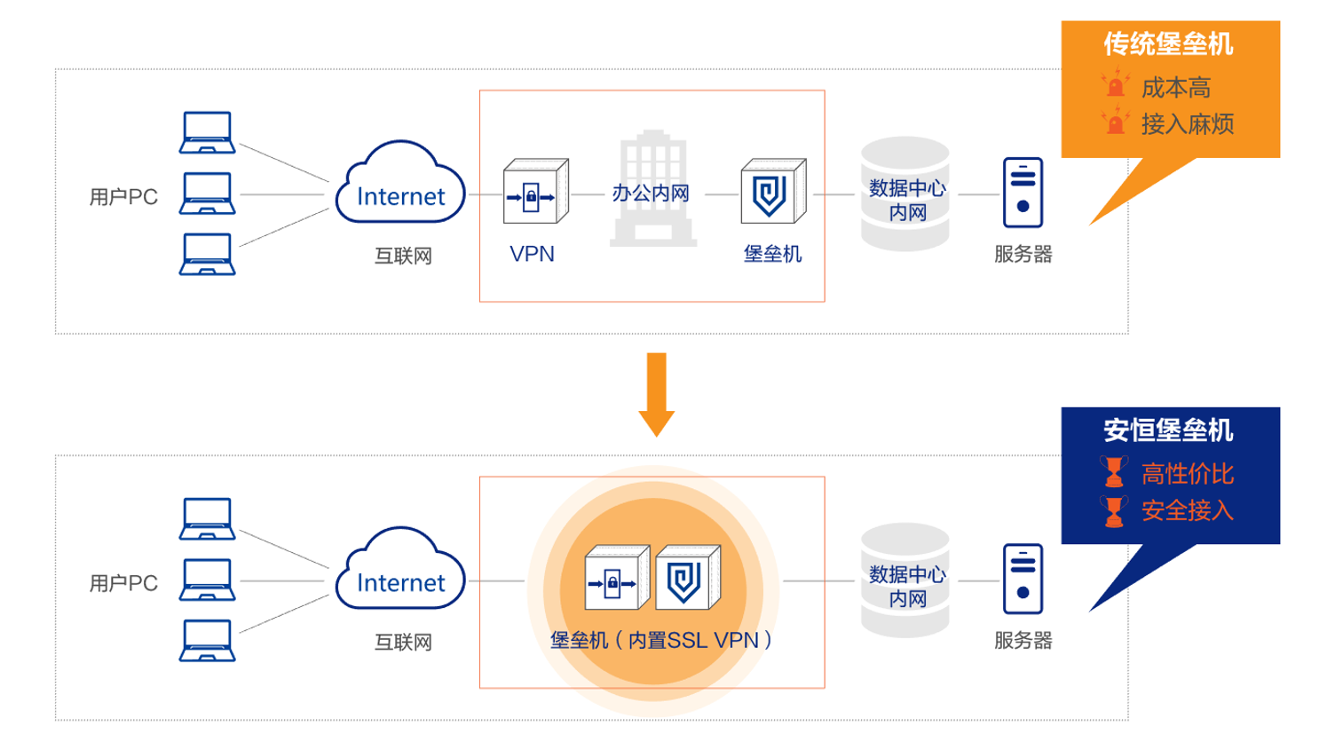 中小型企业,医疗、教育等单位抗风险能力较差,现有安全合规性建设难以满足当前疫情形势下的运维安全,如何降低企业损失,并满足疫情期间的隔离要求,成为各企业单位开展远程办公IT运维安全建设的难题。