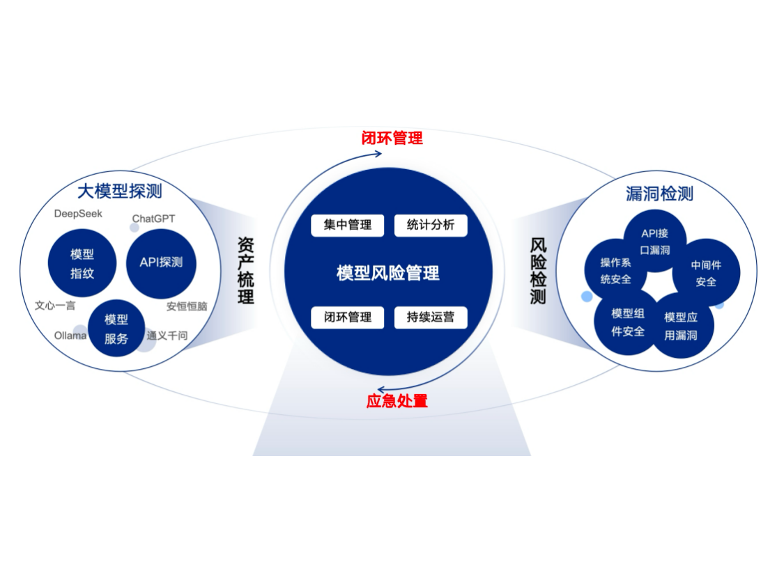 多维度风险探测引擎及闭环处置机制,保障大模型底层系统、中间件、应用组件及语料数据的安全性,覆盖漏洞检测、敏感信息识别等关键环节,实现AI系统全生命周期安全检查。