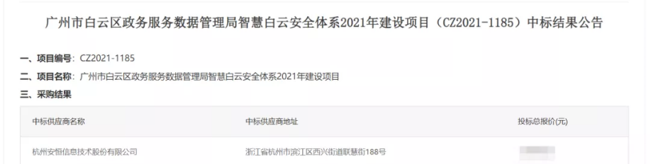 11月,安恒信息以总分第一中标智慧白云2021年建设项目,将与广州市白云区政务服务数据管理局共同应对城市数字化进程中愈加严峻的网络安全威胁,开展智慧白云安全保障体系建设工作。