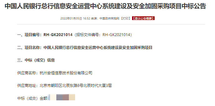 近日,中国人民银行公示了总行信息安全运营中心系统建设及安全加固采购项目结果,安恒信息凭借领先的实力综合排名第一,强势中标!该项目是国内金融行业首个监管单位安全运营中心建设项目,也是安恒信息首个金融行业客户安全运营中心建设标杆项目,该项目的中标和实施交付,将为金融行业客户建设安全运营中心提供指导和借鉴,也将为安恒信息进一步拓展金融行业安全运营市场奠定坚实基础。