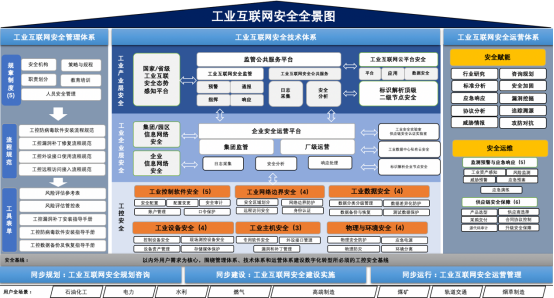在大量的工业互联网安全体系建设实践过程中,安恒信息总结梳理了工业互联网安全全景图,面向工业产业安全、工业企业安全、工业控制系统安全三个维度,在“同步规划、同步建设、同步使用”的三同步原则下,以内外用户需求为核心,围绕管理体系、技术体系和运营体系建设数字化转型所必须的安全基线,形成贯穿企业全业务链的安全解决方案。