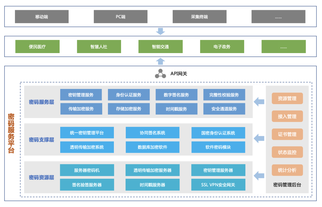 ● 利用平台化手段实现密码能力的整合、复用,提供各类密码服务,实现密码资源按需分配、弹性扩容 。